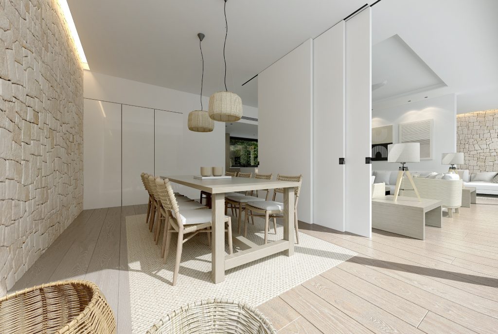 The hight-standing “The forest home” is a concept design with an open layout, focusing on a natural environment where the warmth of materials such as earth-toned masonry, soft oak woods, and a palette of pastel and white tones stand out, providing  very natural overall lighting, elegance, and spaciousness throughout.
